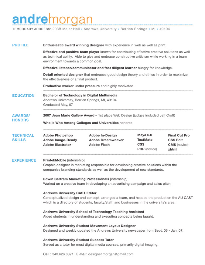 Obviously you shouldn’t be putting your photo on the resume, but the questions remains on how to get people looking at your resumes? The idea is to break away from the standard thinking that Resumes need to be linear. Microsoft word has far more capability now then when you wrote your first resume, and even then it’s better to use Adobe InDesign, Photoshop or even Scribus to create your resume. Resumes don’t need to be linear, but they need to be standard, it needs to have the standard information people are looking for and it needs to be presented clearly. A hiring manager isn’t bothered to look and search for your experience, it needs to be ‘presented’.