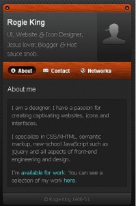 Once again, answers all 3 questions well. Who Rogie is and what personality he/she has just shines through, a section for the about me and contact. Great design.