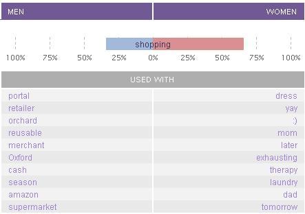 Speaks volumes of the gender difference. Men are more likely to tweet about places to shop, like a Shopping Portal (#1) or a Shopping Retailer (#2) or Amazon (#9). Women are more likely to tweet about the shopping experience itself like dress (#1), shopping with/for mom (#2) and therapy (#8)