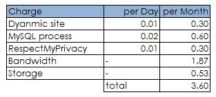 So assuming a month has 30 days, I spend $1.20 for a dynamic site, an MySQL process and RespectMyPrivacy every month regardless of whether I use my website or not
