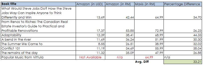 A quick price comparison (image above) between Maxis Ebuuk and Amazon reveals that Maxis Ebuuk is (on average) 33.21% higher than Amazon, that’s a lot of dough, but it’s easily explained with the Malaysian Sales Tax of 20% (if Maxis is even paying it).
