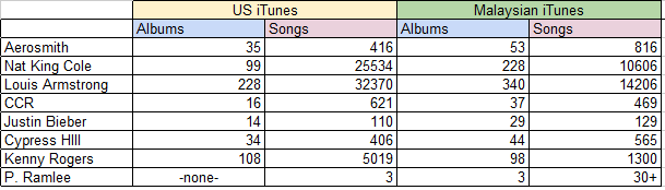 So the list includes local, jazz, country, rock, pop and hip hop superstars and I’d thought it’d be good to see just how many songs and albums for each artist was offered by the Malaysian iTunes store against the US iTunes store. The results were surprising: