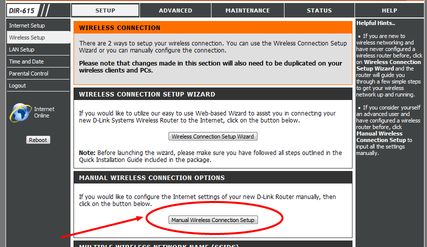 Once there, look for the Manual Wireless Connnection Setup and click that. This will take you to a manual configuration page for your Wi-Fi settings.
