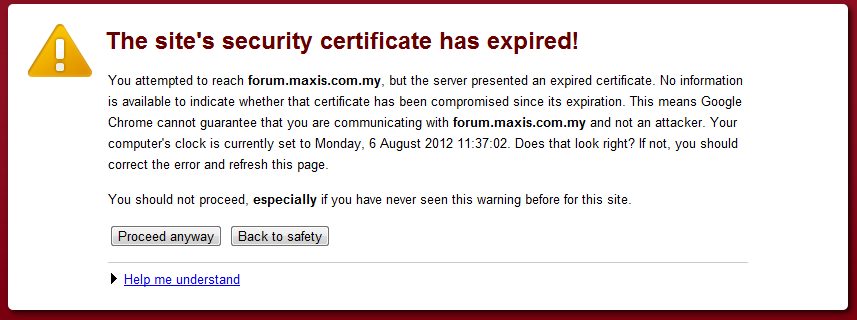 This has since changed, and Maxis have tried now to revert to the original certificate that expired on the 31-Mar 2012. Certificates expire for a reason–certification authorities need a recurring source of income. Just kidding. SSL certificates expire, because just like everything else, if you try long enough to attack a certificate you can eventually figure out the private key based on it’s public key, changing a certificate on a site has almost no impact to the end user, but it keeps your website certificate fresh, so once a key is updated an attacker has to try all over again. It’s the same reason some sites have a strict password renewal policy, mandating you update your password once every 3 months for example.