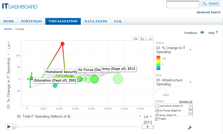 It’s also interesting to note that even US Department of Defence IT spend is listed on the IT dashboard, and isn’t hid behind the veil of secrecy for ’national protection’. The Department of Defence has a long history of working towards smarter IT spend including creating frameworks like DODAF. Their overall IT status looks overwhelmingly Green, with over 83% of projects tracking green for cost and budget, all for the better since just this one Department alone spends more than USD30 Billion on IT. I must also point out that the dashboard for the IT spend is graphical and actually tries to create meaning from the data, unlike the AG’s report which looks like it was created in the 1980’s on WordStar.