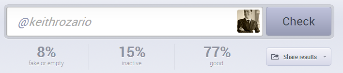 However, I didn’t stop there, I wanted to see how many ‘fake’ twitter followers one could expect from a ’normal’ person. In most cases people can’t control who follows them on twitter, and there’s nothing to stop spam bots from following you. So as a benchmark, I tried the Social Bakers test on myself, and the result were quite impressive (if I do say so myself):