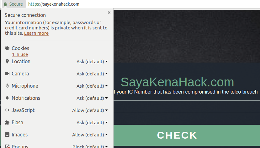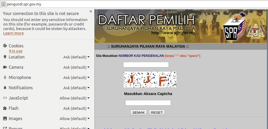 That’s the election commission website, that publishes your full name, and voting location based on a simple IC entry. The site is marked as insecure by Google Chrome because it doesn’t even have TLS.