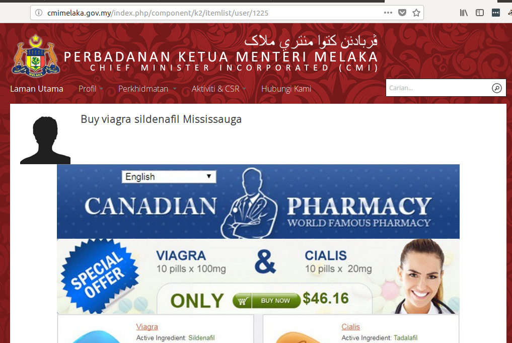 But the most laughable page of all, was the website for the Chief Ministers Office of Melaka – which was hacked (possibly by Russians) to sell Viagra. I contacted them a week ago to let them know, but so far no one has responded, and site is still serving up ads for Viagra and Cialis.