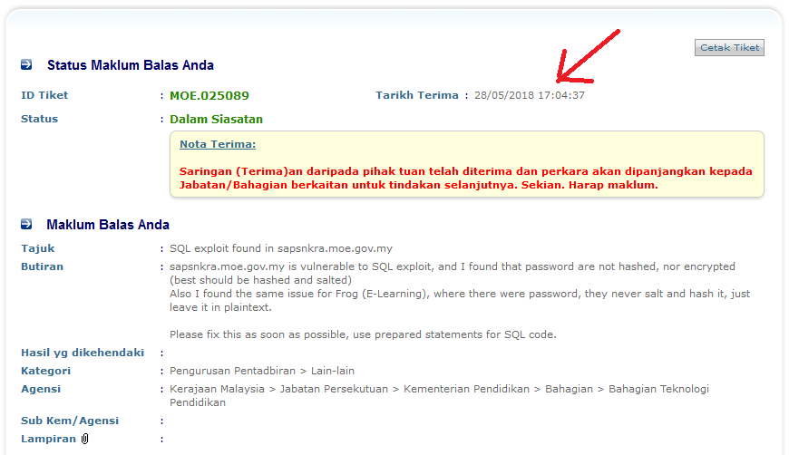 What I suspect is that the Sistem Pengurusan, is a glorified ticketing center, that didn’t comprehend what was being reported to them (after all who knows what SQL Injection is??!), the Sistem then put the complaint through it’s workflow and usual ‘under investigation’ status, which further frustrated the source.