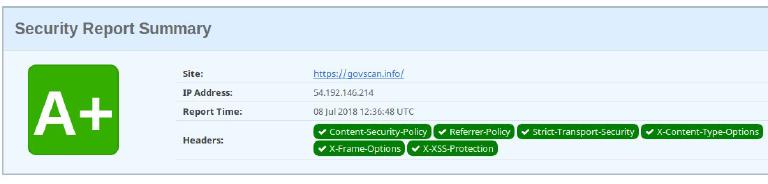 Content-Security-Policy: default-src 'none'; script-src 'self' https://maxcdn.bootstrapcdn.com https://code.jquery.com; style-src 'self' https://maxcdn.bootstrapcdn.com; upgrade-insecure-requests; form-action 'self'; connect-src 'self' api.govscan.info; img-src 'self'; frame-ancestors 'none'; base-uri 'self'; https://cspgovscan.report-uri.com/r/d/csp/enforceIt might look confusing, it's basically a bunch of semi-colon delimited fields, which we can read last-to-first.report-uri https://cspgovscan.report-uri.com/r/d/csp/reportOnlyThis tells the browser to report all violations to the endpoint above. Report-Uri is a collaboration between troyhunt and scotthelme, and it's a great tool to get started for securing your site.