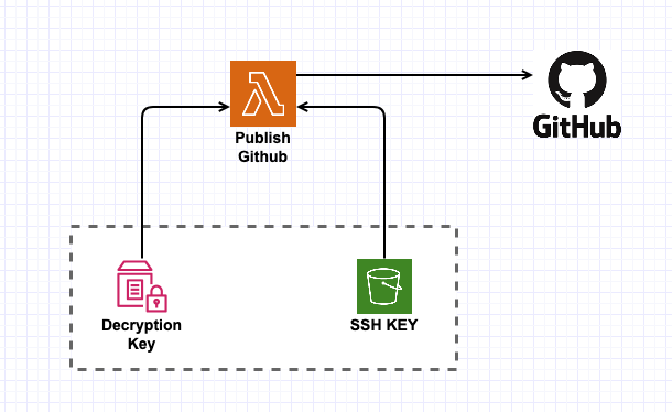 The Lambda function is explicitly granted access to both the bucket, and the specific parameter in the store. With both the Key-Encrypting-Key and the Encrypted Key, the function can easily decrypt and obtain the final SSH key to use for uploading into Github.