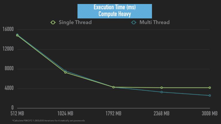 The following diagram shows a simple compute-intensive function of calculating 1,000,000 iterations of PBKDF2 on 4 different strings. The results are exactly as we expect (well sort-off). At memorySize of 1792MB, multi-threading the lambda has no performance gain over single-thread, but after 1792MB, the effects can be seen.