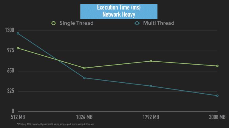 This job wrote 100 items to a dynamoDB table, one item at a time (it's very bad practice, but a good test case for this example). At the lower end of the spectrum ~512MB, the single threaded lambda does better than multi-threaded. We'd expect this, since with just ~33% vCPU, the over-head of multi-threaded actually slows down performance rather than improves it.
