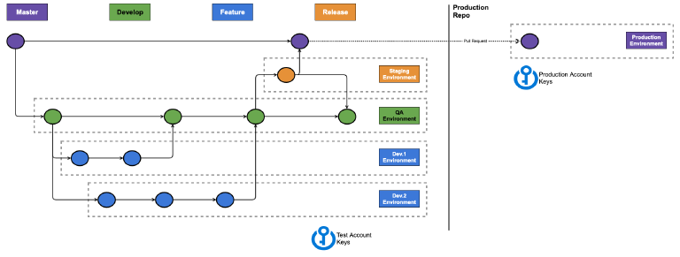 So instead, we should keep the production keys in a separate (forked?) repo, and only deploy to production from there. Obviously this repo should be tightly controlled, and presumably will only accept pull requests from the release or QA branch of a developer repo -- I'm not sure I have an elegant solution here.