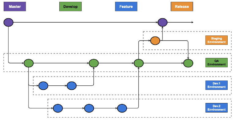 Here we can see how the harmony might work -- if we ensure that branches in git corresponds to stages in framework, we can generate unique environments for each branch, and have that propagate all the way from feature branch to master.