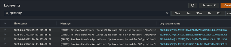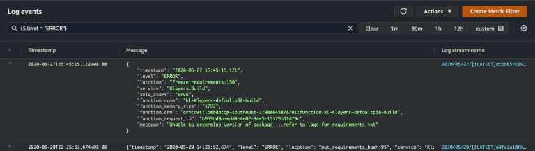The major downside though, is if we have a uncaught exception, they tend to bypass the structured log output and print out non-JSON lines in the tab-delimited manner we saw earlier. However, we can still search for them by simply searching for "[ERROR]". From there, because we have a timestamp, and logStream, we can manually drill into the event. Less elegant, but still workable.