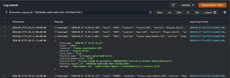 Because if we search for just the request id, we can filter down to the specific lambda invocation that caused the error, and inspect the entire log messages from start to finish for just that single request. In this example we simply search for {$.function_request_id = "b959bd9a-edd4-4e02-94e5-15379a31479c"} :