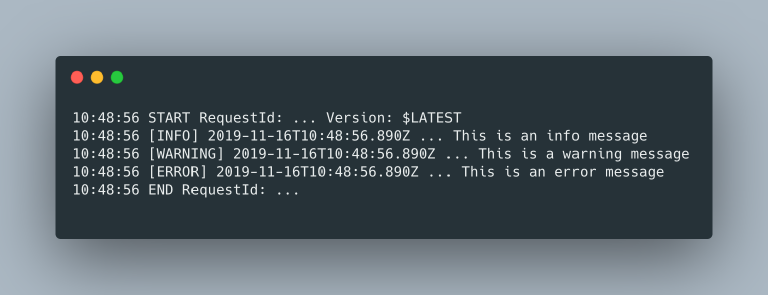 If you ran the code above in a Lamba Function, you'd get the following logs in cloudwatch (I removed some superfluous data)