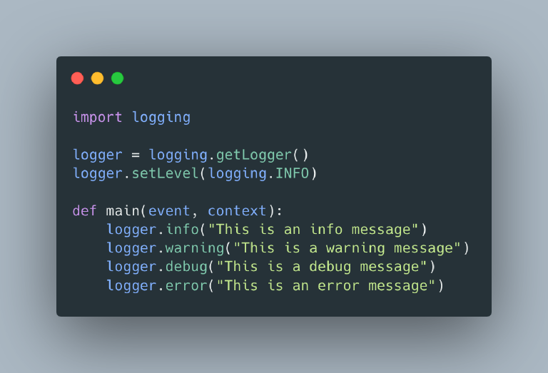 - Ensure the Logging Level (INFO, DEBUG) is not hard-coded into the function, but set as an environment variable which can be changed when you need to.