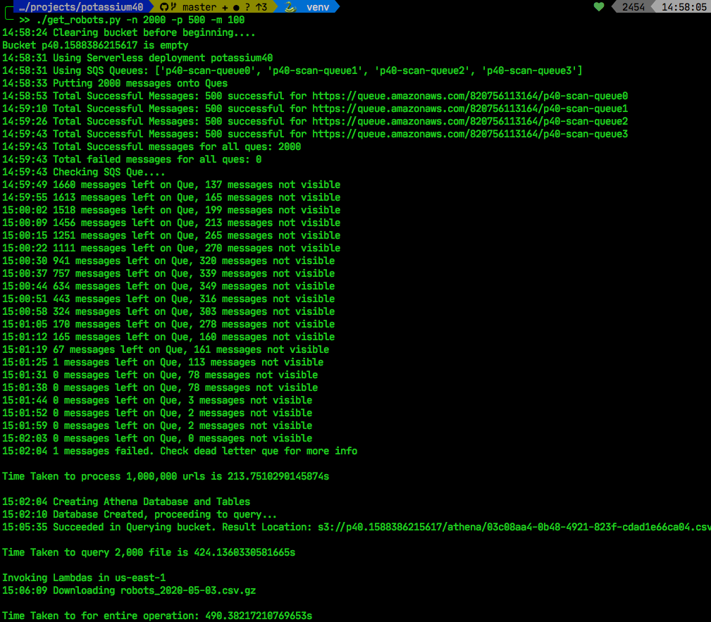 Potassium40 was a project I started to see how fast Lambda could really go. The project attempts to download the robots.txt files from 1 million websites as fast as it can. I chose robots file because -- well it's supposed to be downloaded by robots anyway, so this was both great fun, but also completely ethical as I wasn't scraping people's websites.