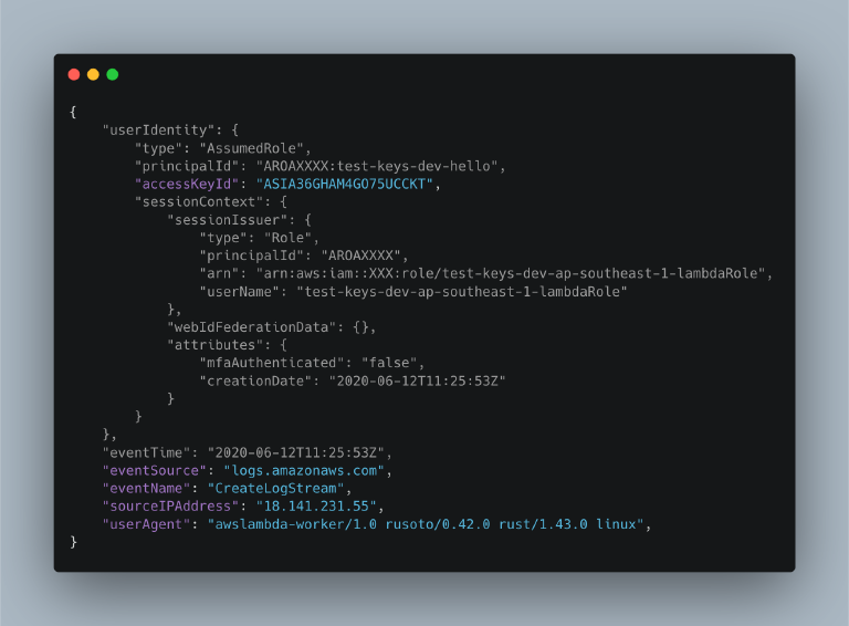 The next event for this function is logs:CreateLogStream, which is executed from the lambda container using the newly minted access keys (from AssumeRole). Notice here we have an actual sourceIPAddress field and userAgent, but more importantly, we can see that the userIdentity.accessKeyId matches the key id from the previous event. Here's the event: