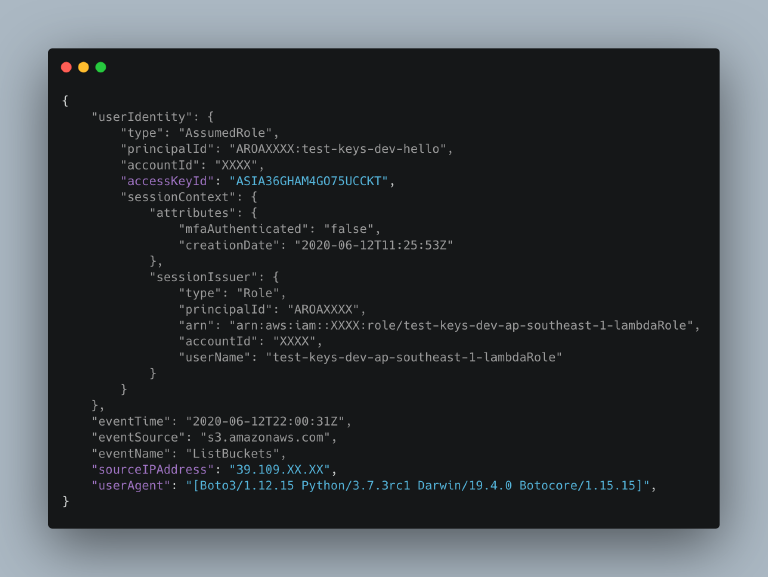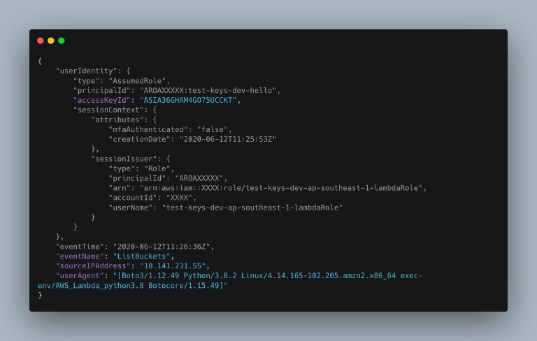 To test this theory, I created a lambda function that ran every 3 minutes, and kept it running for over 10 hours. The function performed one API Call that listed all the accounts S3 buckets, the actual call is irrelevant, it's purpose is to help us log the usage of the access key in CloudTrail.