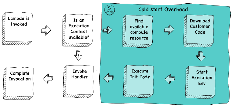 Every lambda function starts as a piece of code stored within the Lambda service. When the function is first invoked, it undergoes a cold-start, which creates an execution context for that function before executing it. If the subsequent invocation occurs shortly after, Lambda re-uses that execution context, resulting a much quicker warm-start.