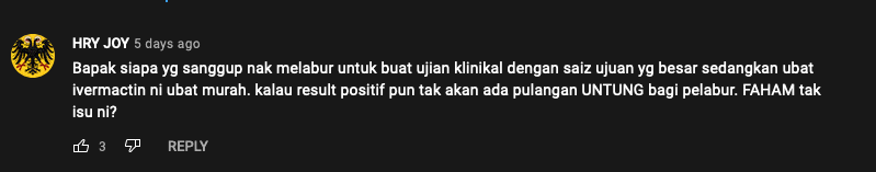 You believe the Malaysian government is intentionally letting people die in order to help big pharma. After all, if Ivermectin was effective as you believe, maybe our death rate wouldn't be as high as it is. Accusing a government of incompetence and corruption is one thing, accusing it of recklessly endangering the lives of its citizens is another altogether.